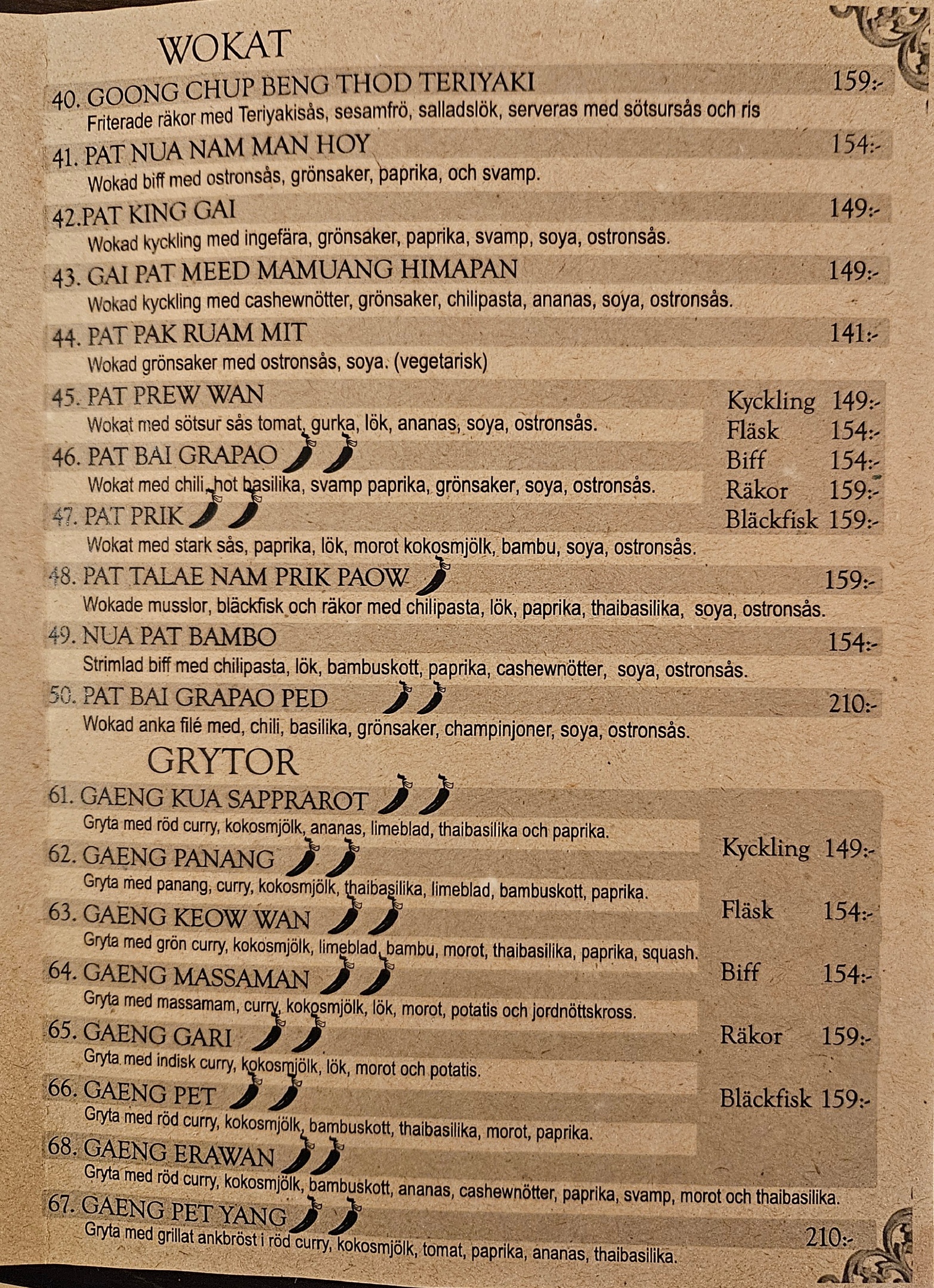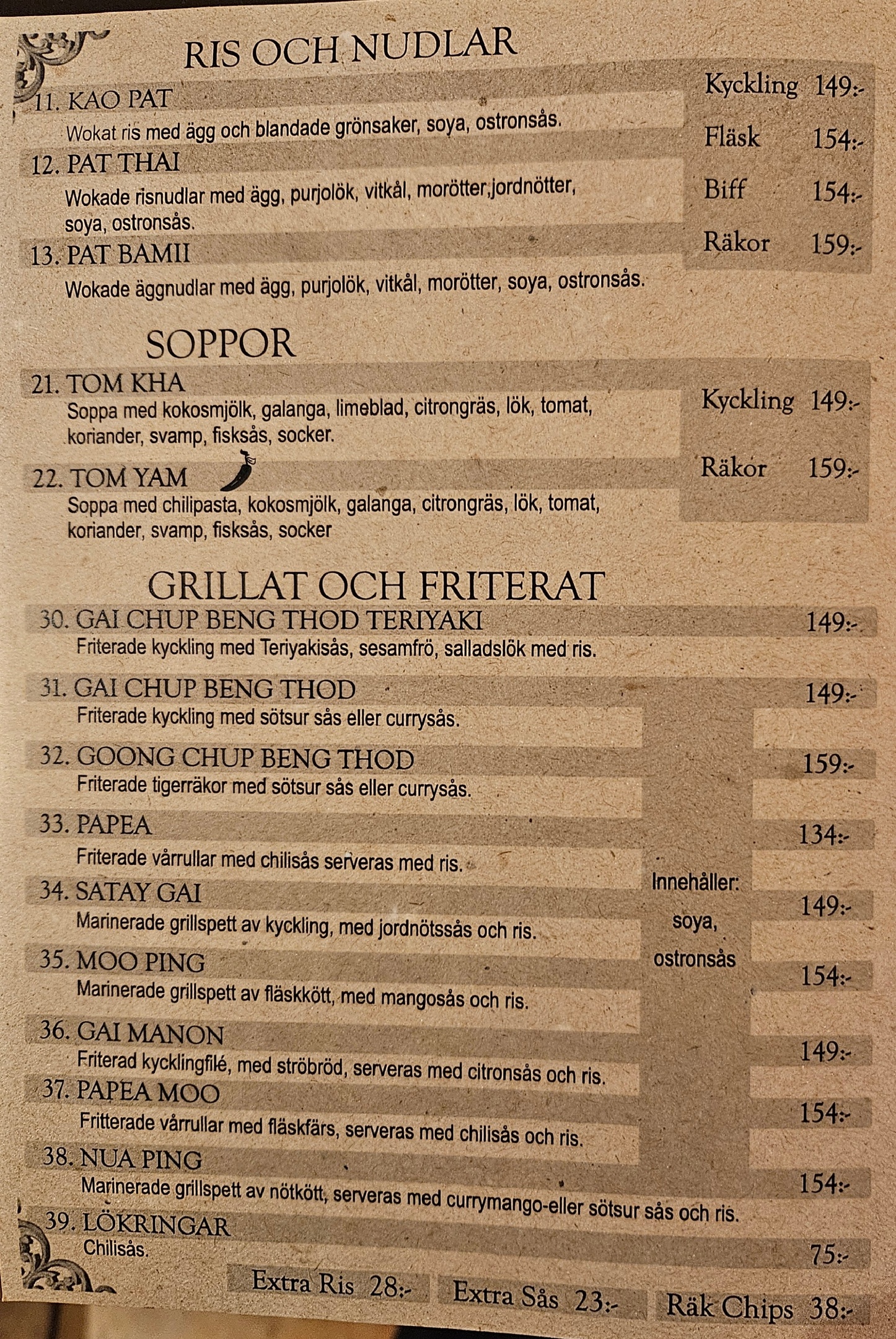 Tom Yam: Soppa med chilipasta, kokosmjölk, galanga, citrongräs, lök, tomat, koriander och svamp. Kyckling eller Räkor